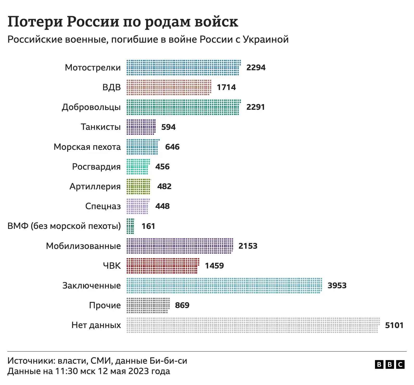 Якщо говорити про поділ за категоріями. То за останні місяці найбільше зазнали втрат ті загони, в яких воювали зеки. З грудня 2022 року під час спроб штурмувати Соледар і Бахмут загинули щонайменше 3 100 "завербованих" ув'язнених.