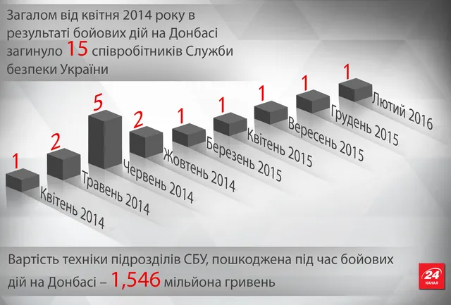 Серед них і співробітники Служби безпеки України – загалом через бойові дії під час виконання службових обов'язків загинуло 15 співробітників СБУ. Такі дані надало Управління взаємодії із засобами масової інформації та громадськістю СБУ у відповідь на офіційний запит журналістів сайту "24".