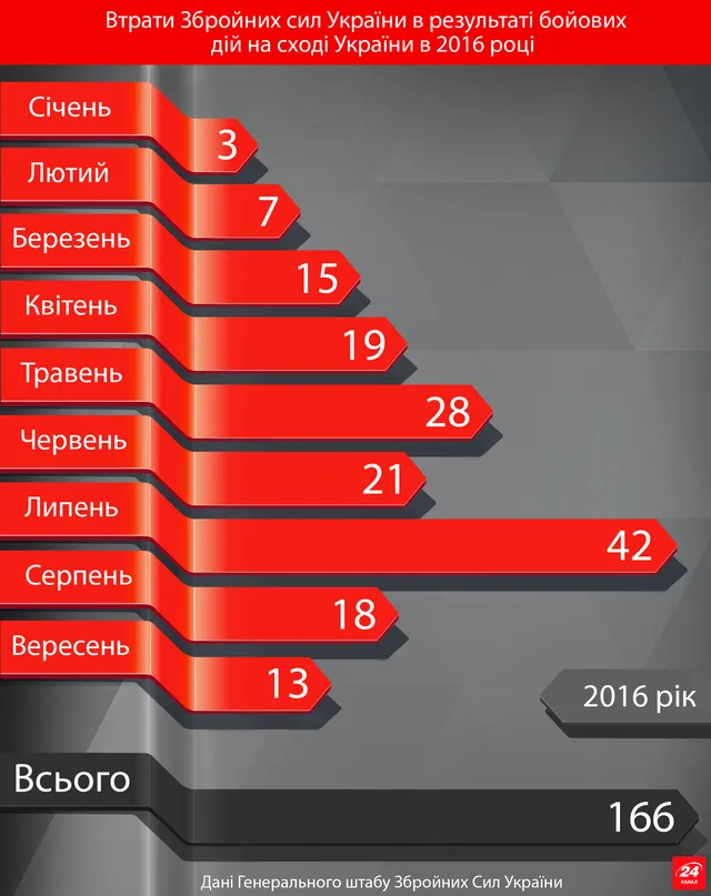 Незважаючи на те, що у 2016 році серйозного загострення на фронті не було, тим не менше Збройні Сили України втратили ще 166 героїв.