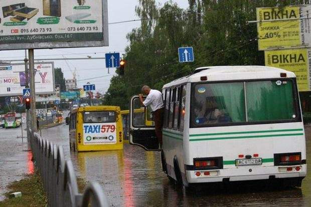 Проспект Соборності перетворився на величезну річку. Маршрутки, автобуси і приватні автівки їхали по колеса у воді.