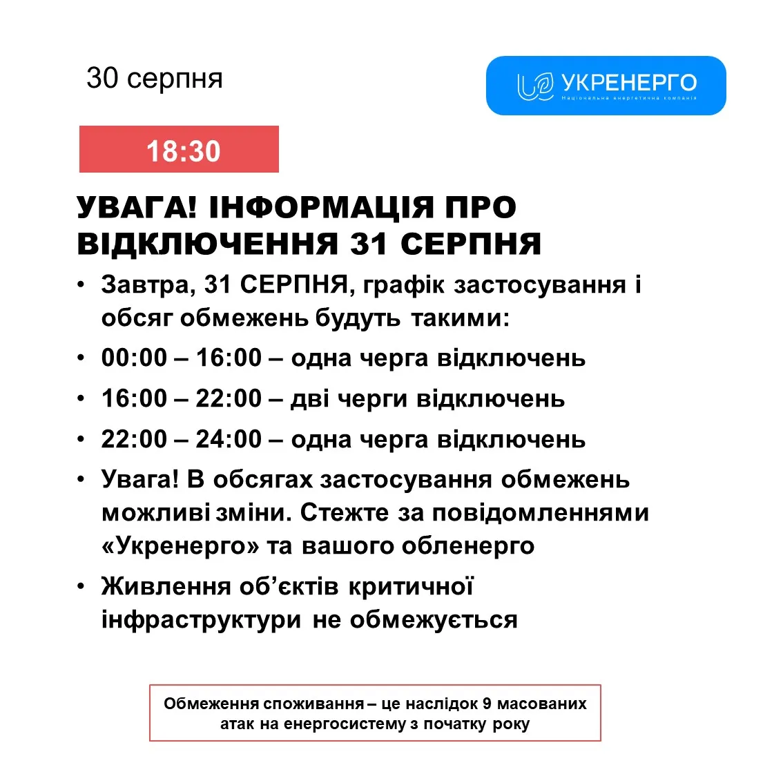 Відключення світла 31 серпня / Інфографіка Укренерго
