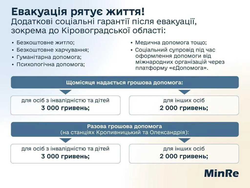 Для евакуйованих організоване безкоштовне проживання у Кіровоградській області. Також людям нададуть безкоштовне харчування, гуманітарну, психологічну та медичну допомогу.