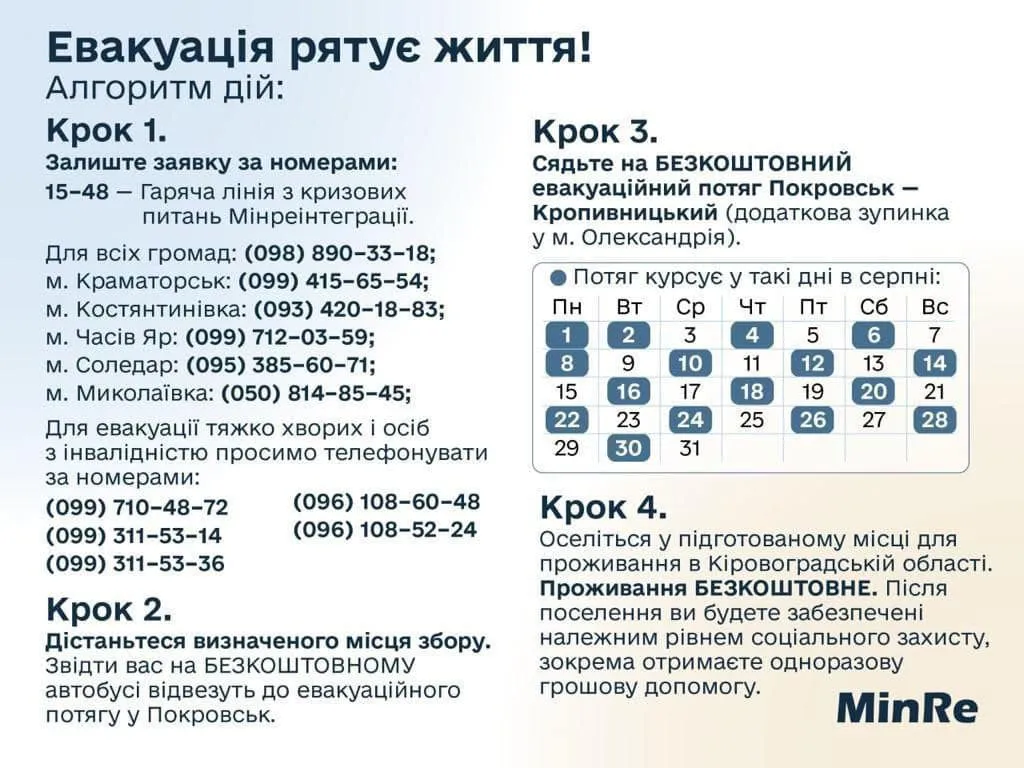 Людям, які хочуть виїхати з Донеччини, потрібно безкоштовним автобусом добратися до Покровська, звідки відправляється евакуаційний поїзд до Кропивницького.