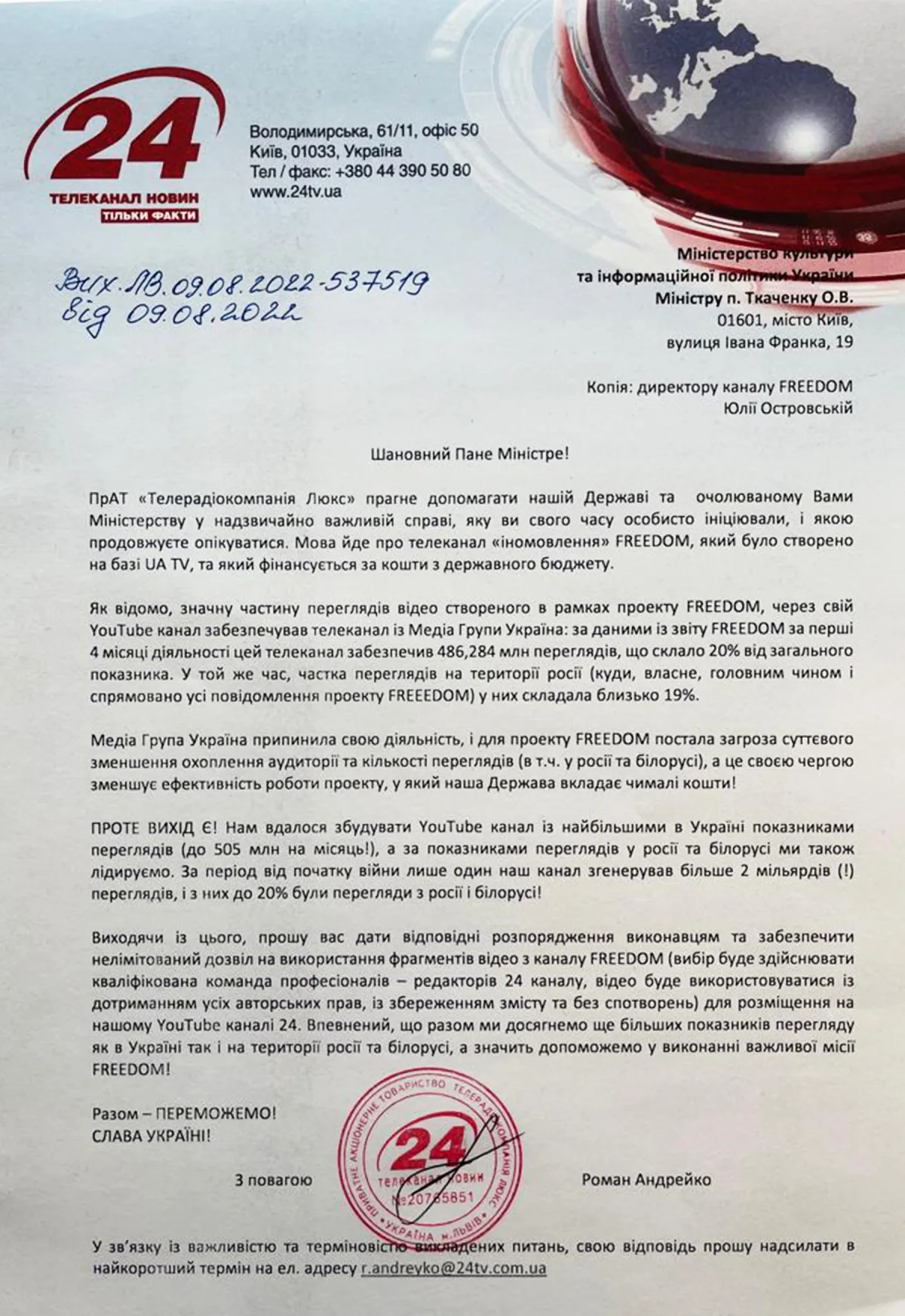 Лист гендиректора ТРК "Люкс" Романа Андрейка до міністра Ткаченка: