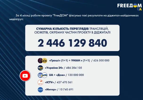 - Після "анулювання" медіа Ріната Ахметова, ресурси якого активно ретранслювали контент FreeДом, утворилася "просадка", як в охопленні аудиторії, так і в кількості переглядів відео, а відповідно й "незахищений фланг на інформаційному фронті" (нагадаємо, наразі Україна живе в умовах війни, а тому такі паралелі цілком доречні).