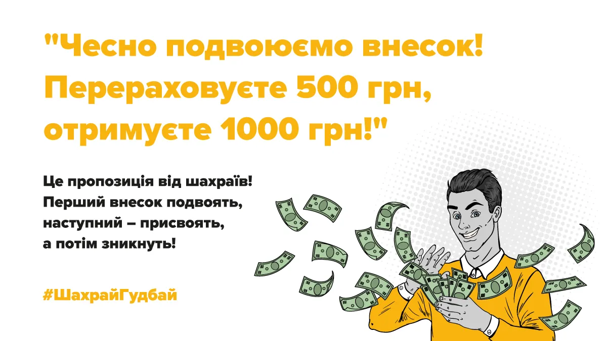 Людина отримує пропозицію переказати певну суму грошей з можливістю отримати вдвічі більше. Наприклад, спочатку вас попросять надіслати 100 гривень, натомість шахраї вам перекажуть 200 гривень, однак наступна сума вашого внеску почне збільшуватися, водночас подвоєних грошей ви так і не отримаєте. Здається, це – проста схема, в яку майже ніхто не повірить, але, на жаль, є люди, які потрапляють до цієї пастки.