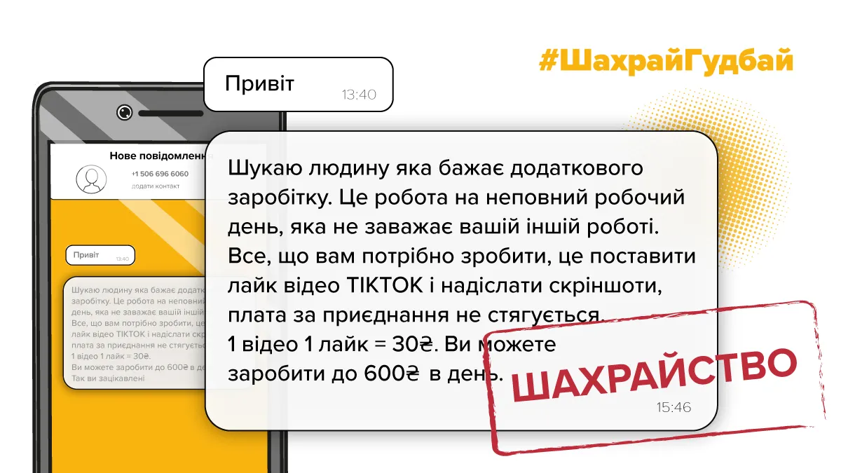 - не реагуйте на пропозиції щодо подібної онлайн-роботи. Вони можуть надходити через різні месенджери із закордонних номерів, що починаються на +1, +8, +6 тощо;
