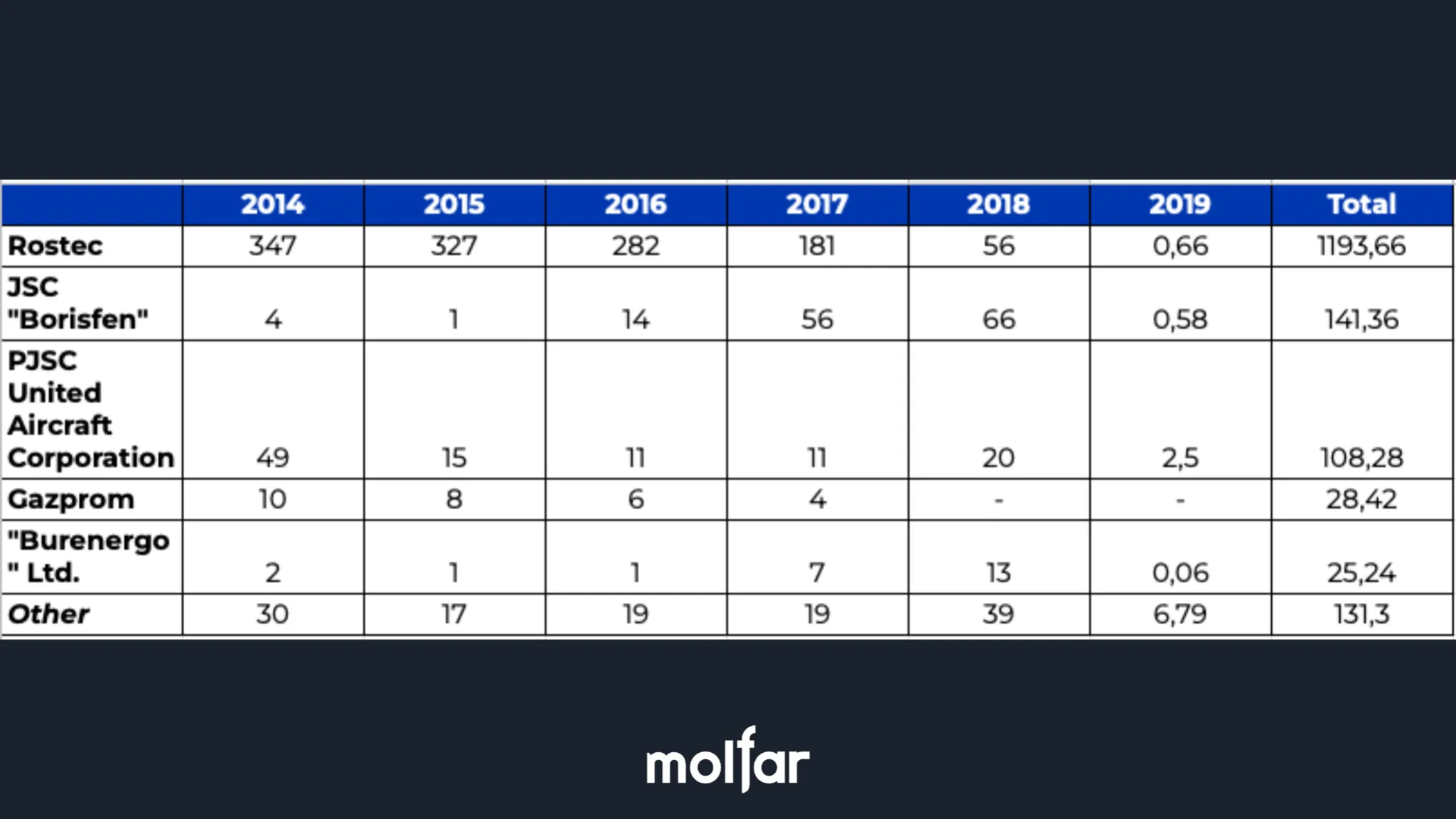 Російські компанії, з якими "Мотор Січ" співпрацювала найбільше (2014 – 2019 рр.) / Інфографіка – Molfar
