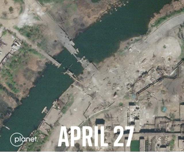 Один з основних способів потрапити на територію заводу з міста – по двох мостах через річку Кальміус. На супутникових знімках видно, що 10 березня мости ще були цілими, але до 27 квітня їх вже повністю знищили.