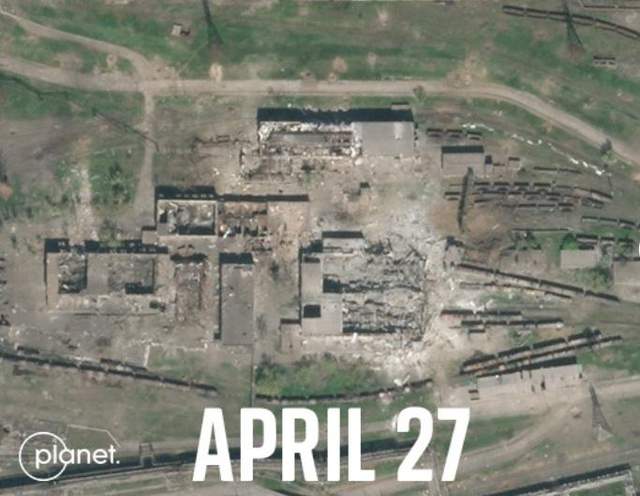 Аналогічна ситуація зі складовими приміщеннями. І якщо ще 27 квітня вони були цілими, то 1 травня вони були вже повністю зруйновані. Зауважимо, що якраз 1 травня після кількаденного режиму тиші росіяни почали знову обстрілювати завод попри те, що там досі перебували цивільні люди.
