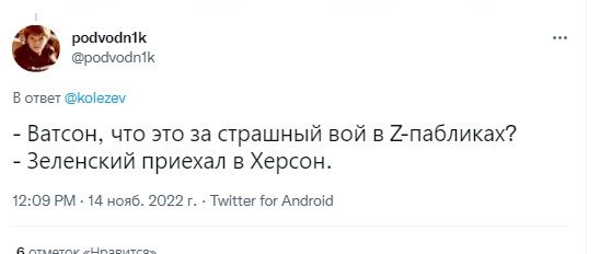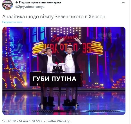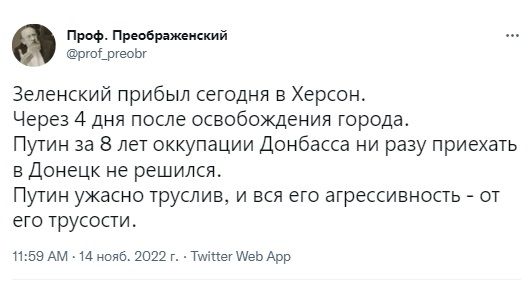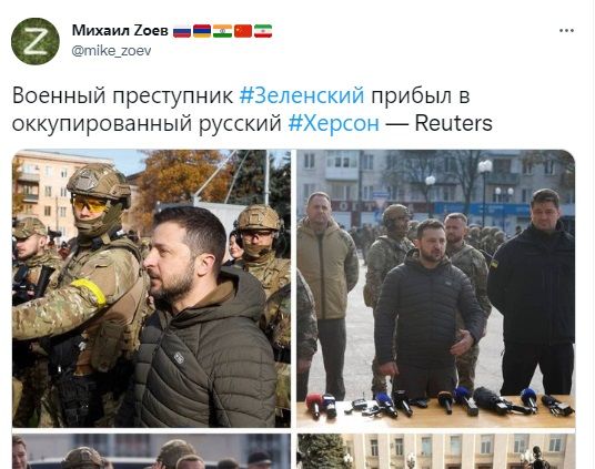 Користувач "Проф. Преображенский" зауважив, що Зеленський прибув у Херсон через 4 дні після визволення міста.