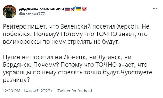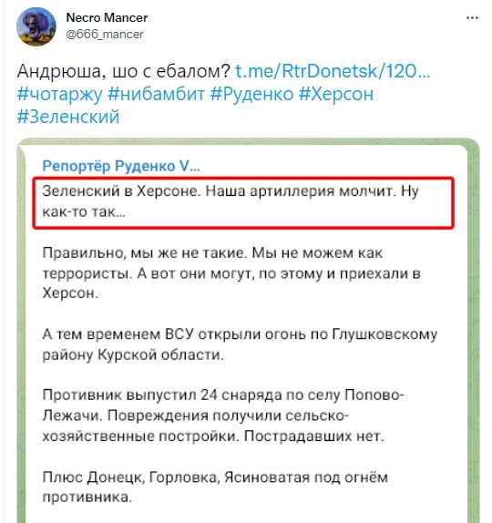 Пропагандисти кажуть, що нібито вони "не такі", "не стріляють" по Херсону. Проте росіяни сміються з таких заяв та питають посіпаку Путіна: "Андрійку, що з **алом?".