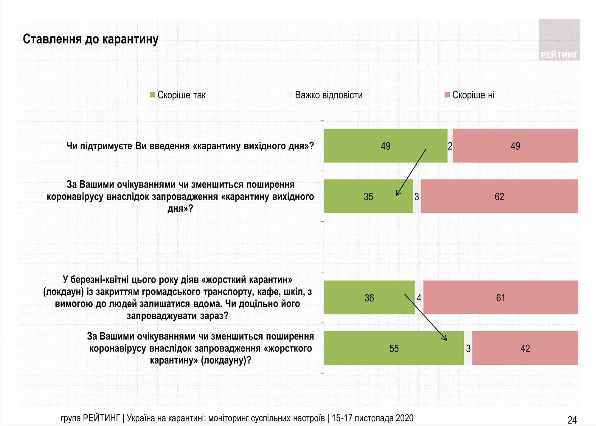 Його протягом 15 – 17 листопада провів "Рейтинг". Телефоном опитали 3 000 респондентів по всій Україні, окрім окупованих територій. Помилка репрезентативності дослідження – не більше 1,8%.Карантин вихідного дня: коротко