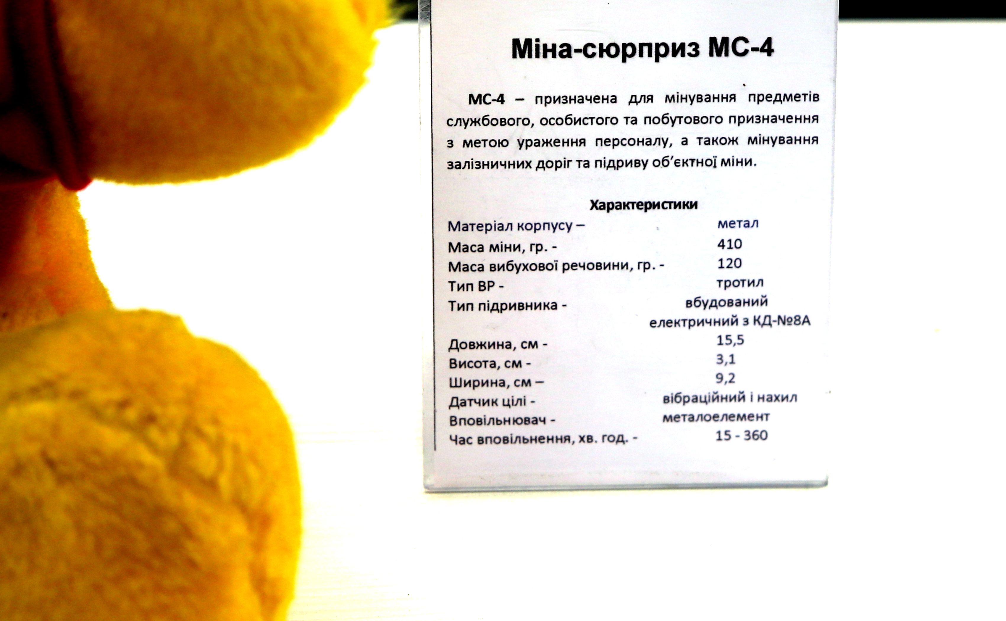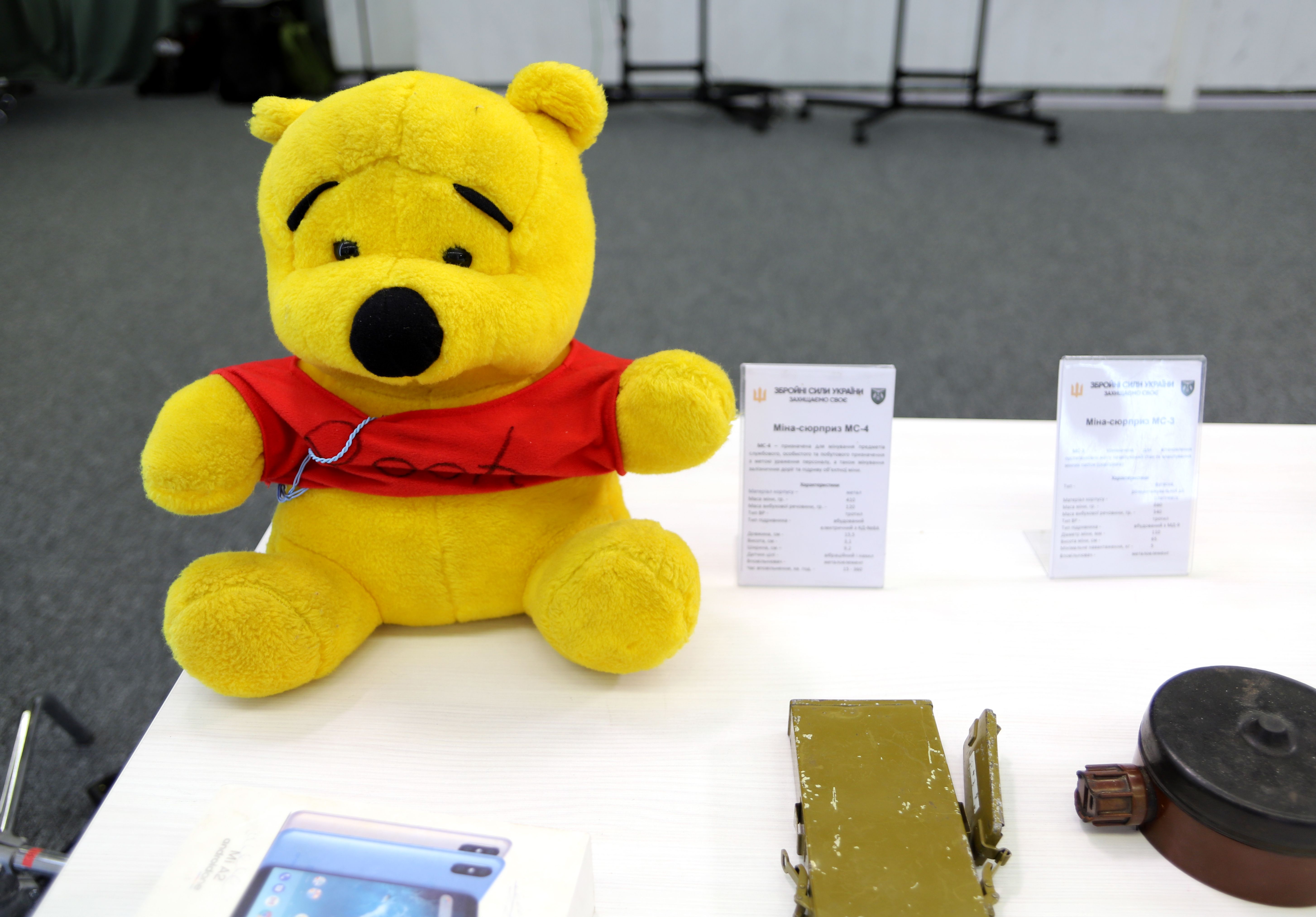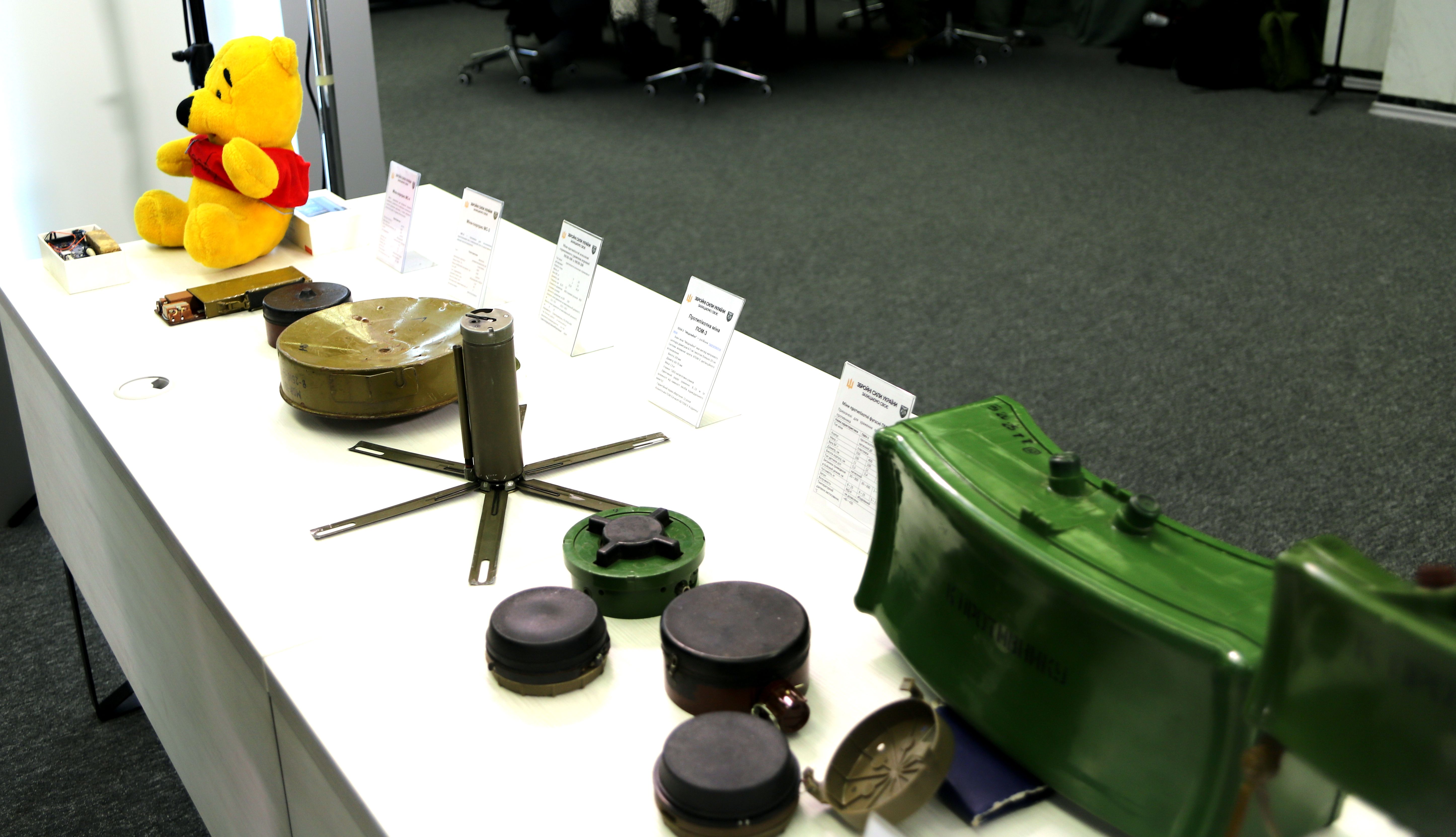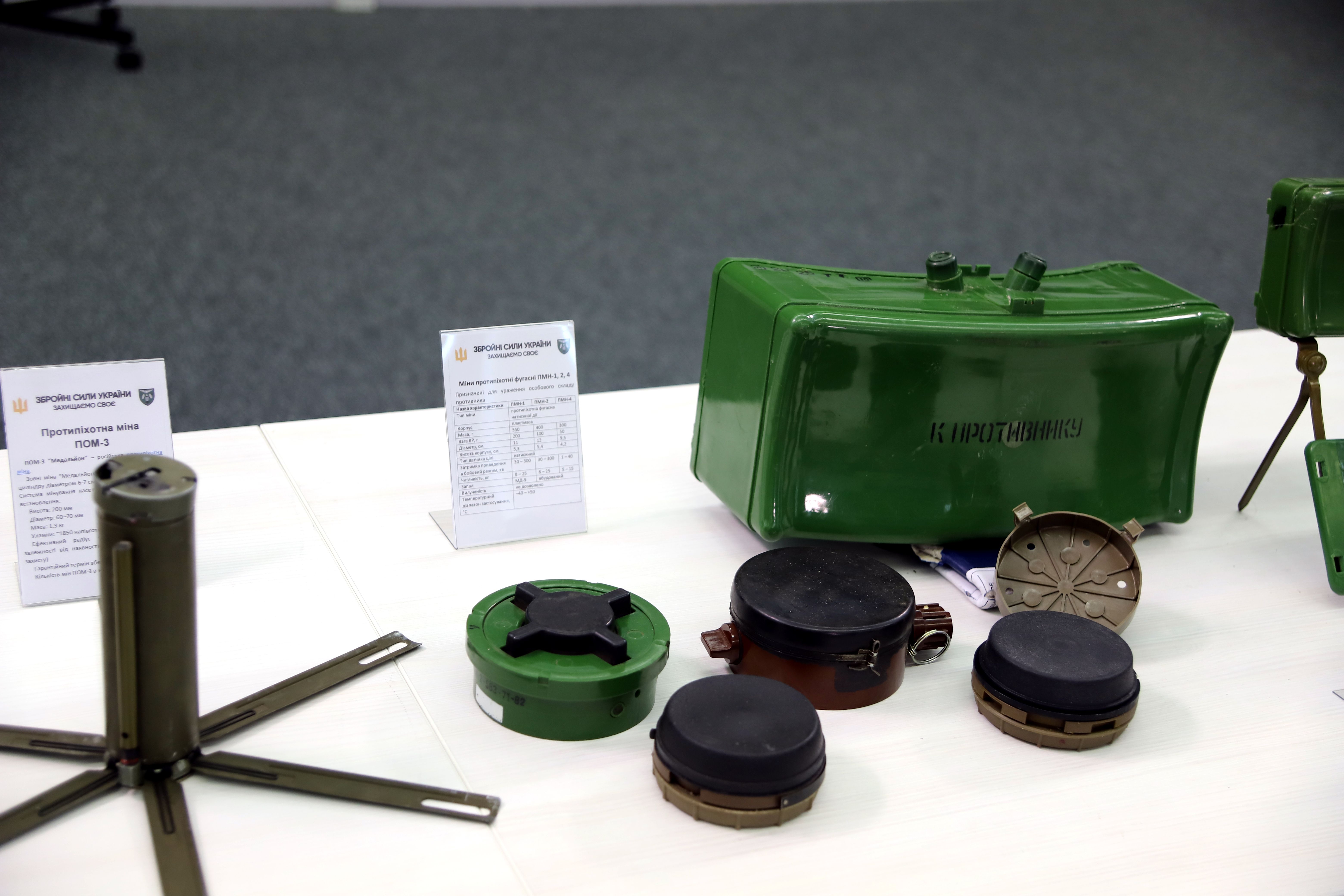 На брифінгу також представили серійні зразки мін та саморобні вибухові пристрої, які знешкодили Сили оборони. Росіяни масово застосовують різні типи мін для унеможливлення розмінування. Крім того, в росії серійно випускаються у промислових масштабах міни-пастки, так звані "міни-сюрпризи", призначені для мінування побутових предметів. Такими вибуховими пристроями російські окупанти мінують побутову техніку, продукти харчування і навіть дитячі іграшки.