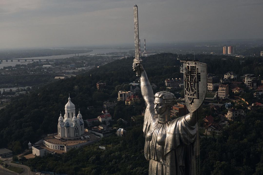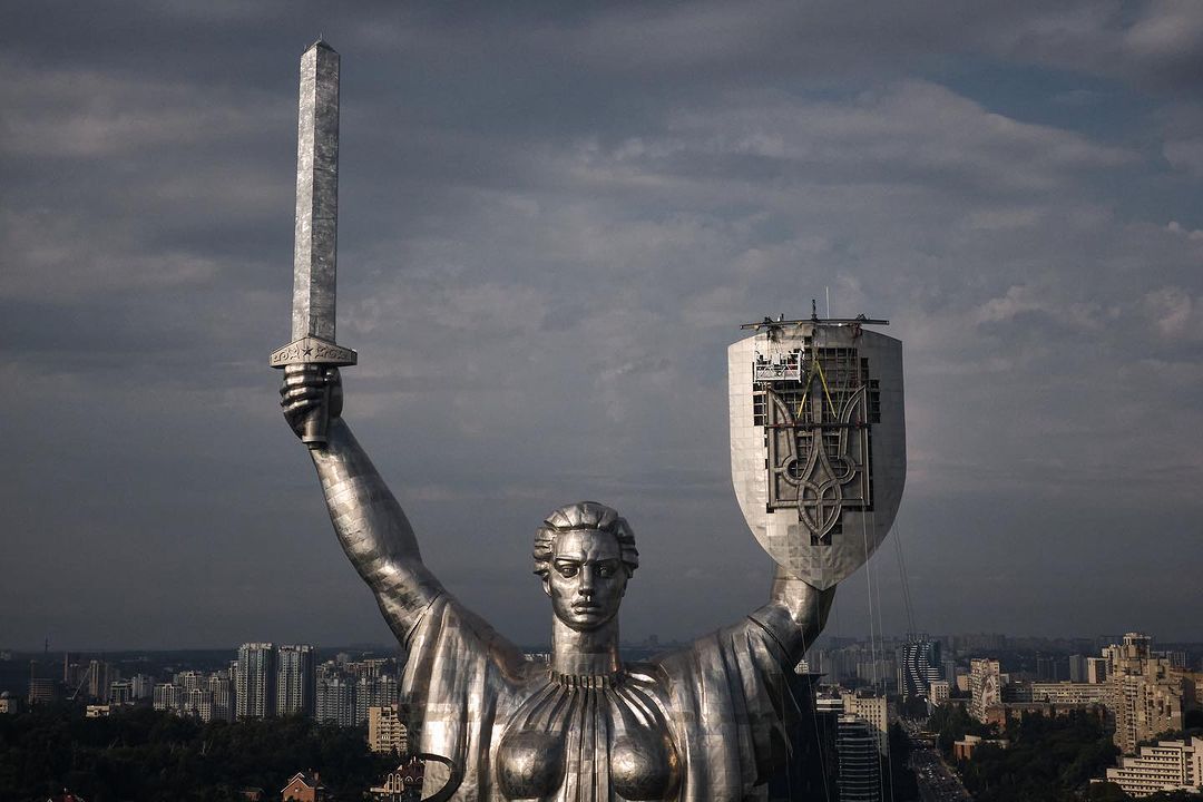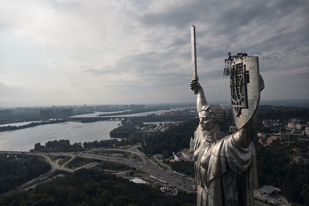 Фотографи Костянтин і Влада Ліберови показали яскраві кадри оновленого щита монументу "Батьківщина-мати". Остаточні роботи планують завершити до Дня прапора України – 23 серпня.