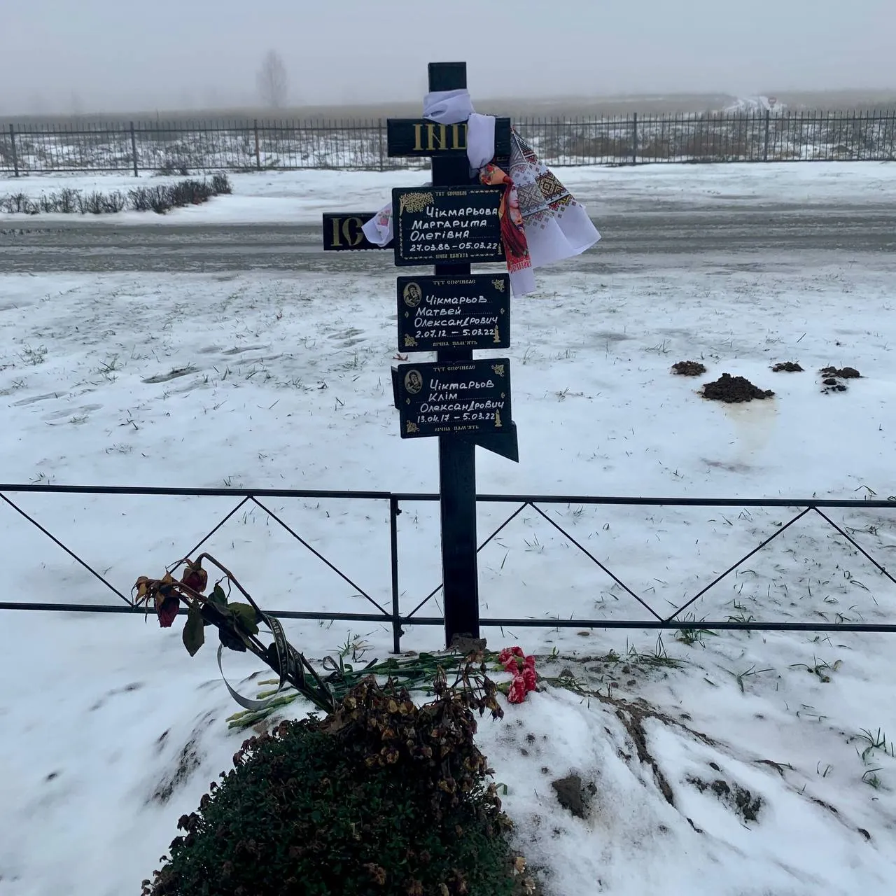 На цьому кладовищі спочиває родина Чікмарьових – Маргарита, Матвій та Клім. Матір та двох синів вбили пострілами з БМП, коли вони намагалися втекти від війни.