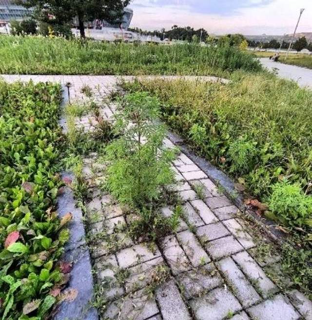 На знімках можна побачити висохлі дерева, які у парку колись спеціально висаджували, а також бур'яни, які стали вищими від лавки та пробиваються крізь плитку.