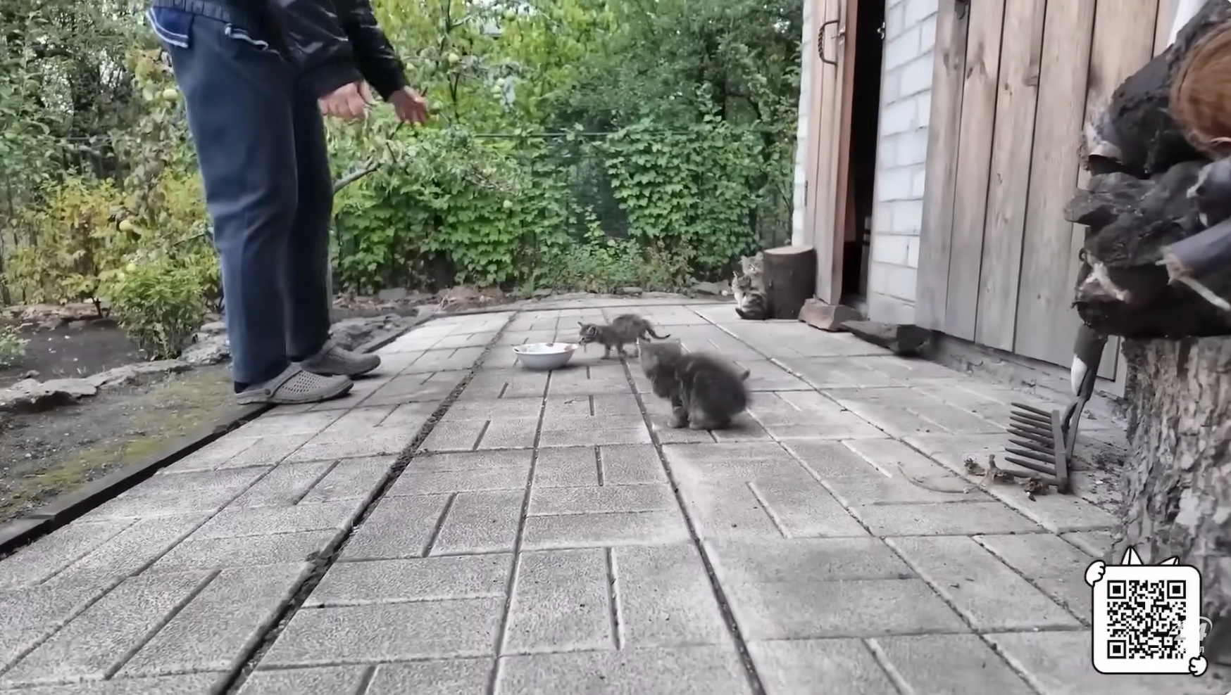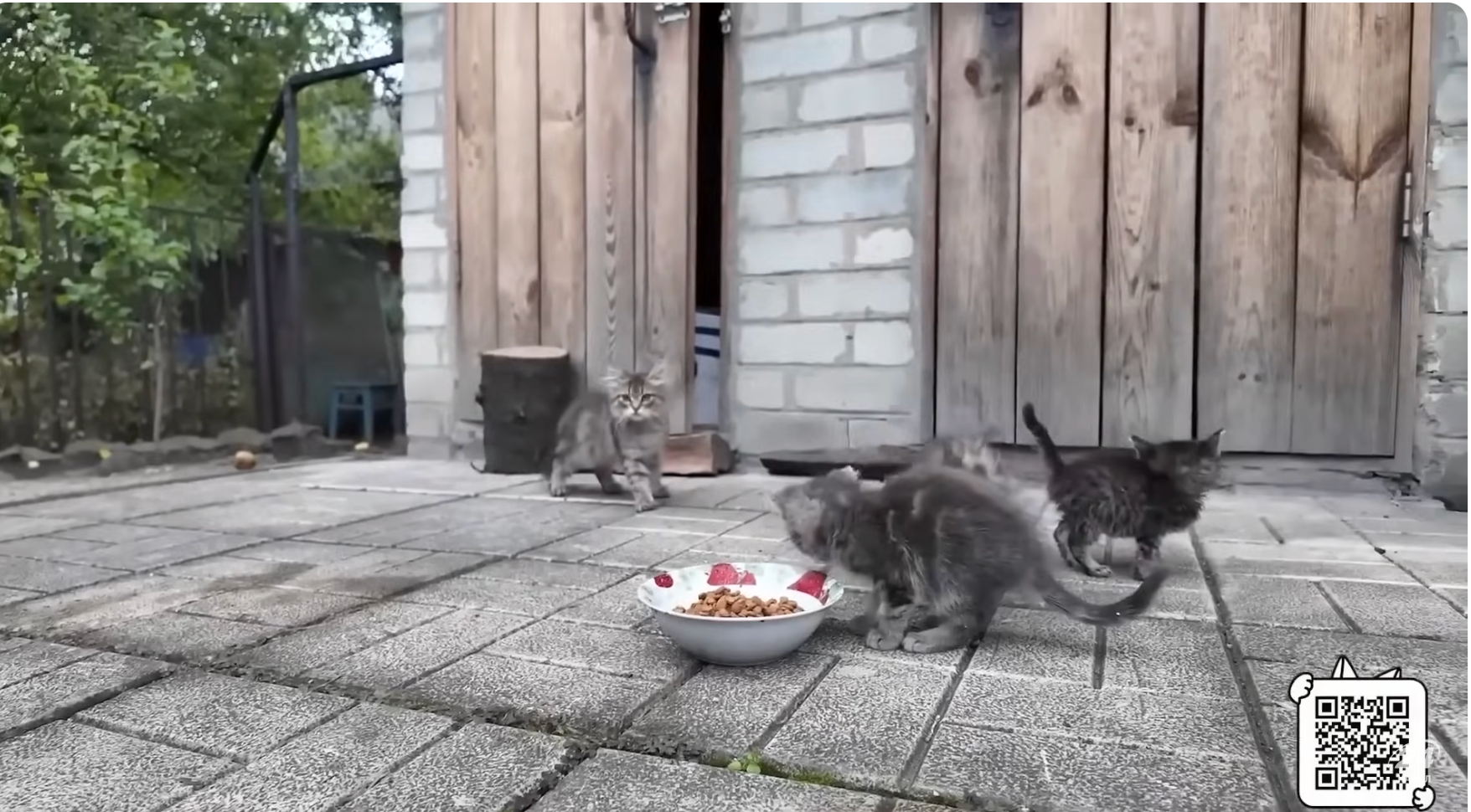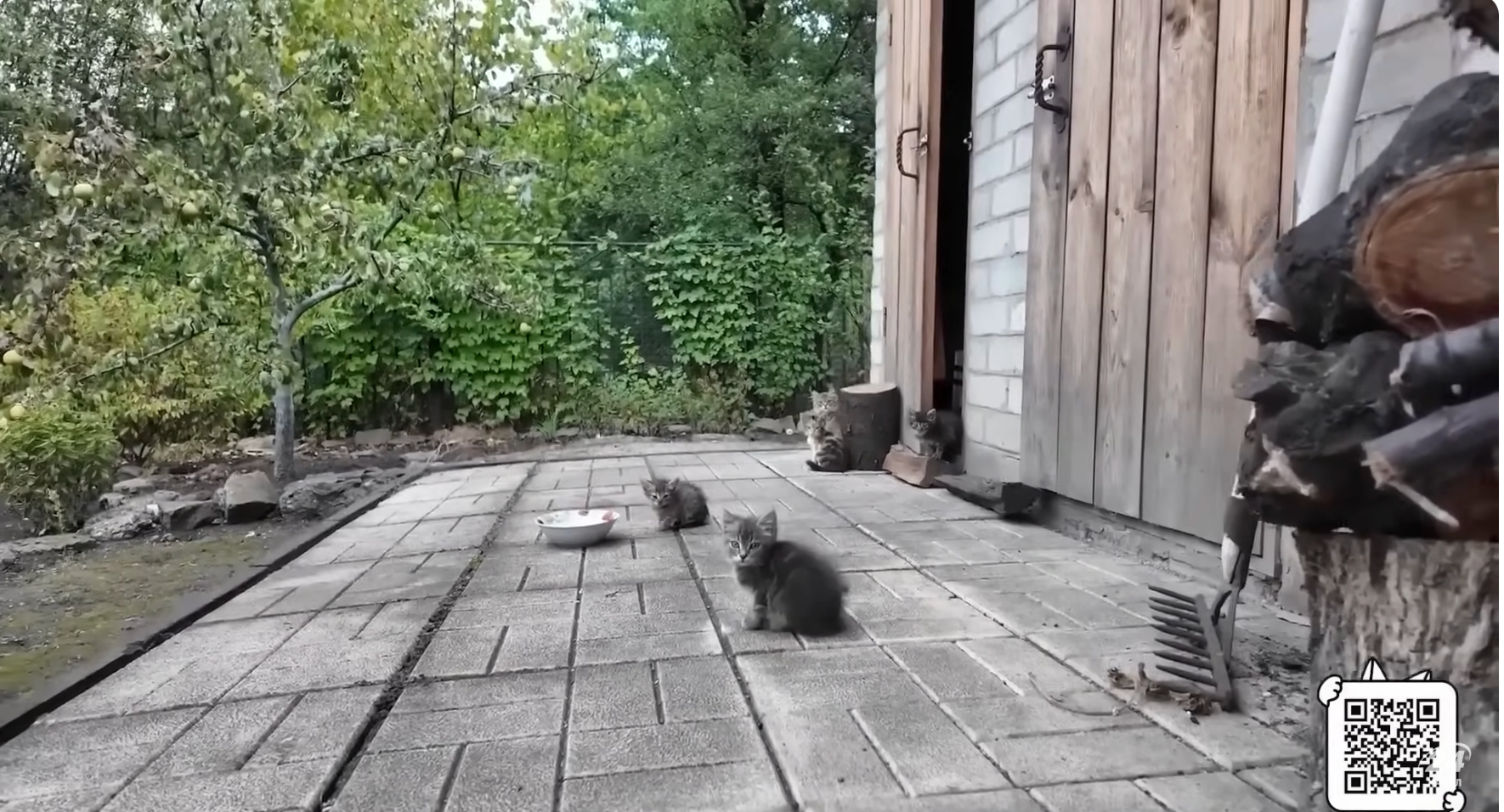 Кошенята живуть у будці з пінопласту. Олена годує їх та доглядає. Часто тварини перелякані через обстріли. Як тільки вони їх чують, то одразу втікають і ховаються. На жаль, звуки вибухів у Добропіллі майже постійні.
