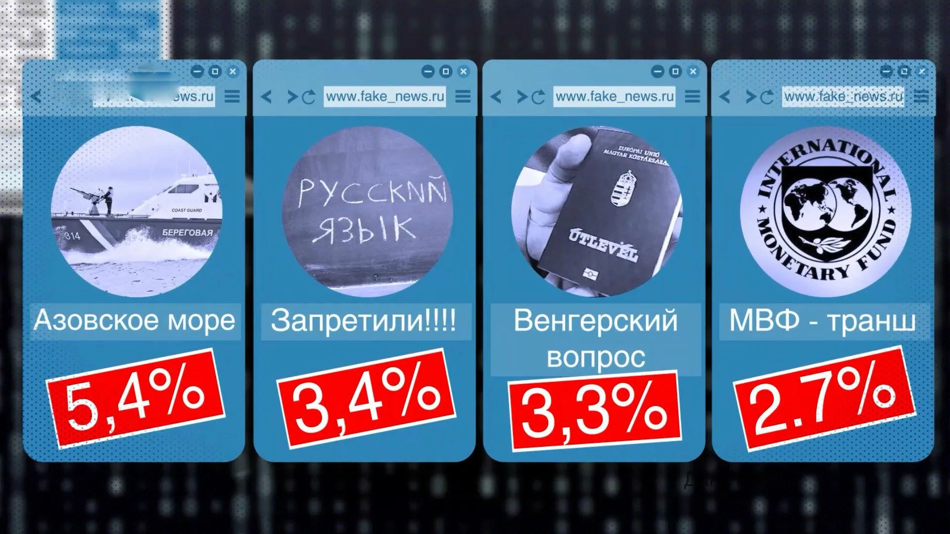 Замикає топ-10 інтересів російських інтернет-видань Азовське море – 5,4%, ситуація в Україні з російською мовою – 3,4%, угорські паспорти – 3,3% і МВФ – 2,7%.