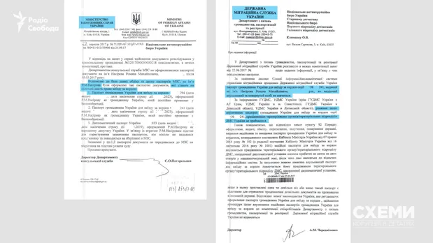 Журналісти наводять лист Міграційної служби на адресу НАБУ від 27 червня, отриманий на запит програми, в якому йдеться про те, що "паспорт громадянина Насірова Р.М. № СDххх241 як недіючий, анульований та повернутий особі не значиться, а рішення про його анулювання співробітниками не приймалося". Ці дані підтверджує і лист від МЗС, датований 29 вересня 2017 року.