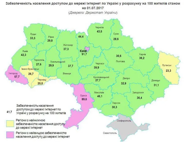 Забезпеченість населення інтернет-послугами у розрахунку на 100 жителів по Україні становить 41,7. Найвищий рівень спостерігається в Одеській, Закарпатській областях та місті Києві, а найнижчий — в Івано-Франківській, Чернівецькій та Луганській областях, порахували у НКРЗІ за даними держстату.