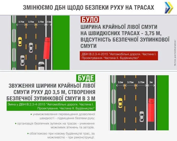 Відповідно до запропонованих змін, ширину крайньої лівої смуги для швидкісного руху легкового транспорту пропонується звузити з 3,75 метра до 3,5 метра. Крім того, внаслідок оптимізованої лівої смуги на дорогах 1 і 2 категорій, планується робити зупинкову смугу шириною не 2,5 метра, а 3.