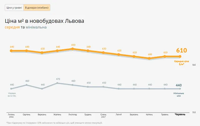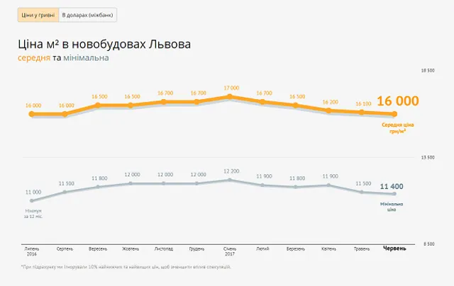 Ринок нерухомості завжди чутливо реагував на всі події, що відбуваються в країні. Показником стабілізації економічної ситуації є істотне зменшення темпів падіння вартості житла в більшості міст України. Наприклад, у Львові мінімальні ціни на квартири в новобудовах за рік практично не змінилися. Як і в липні 2016 року, зараз найдешевше житло можна придбати за ціною 440 доларів США за метр квадратний. Що цікаво, якщо оцінювати житло в національній валюті, то найменша ціна зараз становить 11400 грн, що всього на три з половиною відсотка більше, ніж рік тому – це приблизно корелює з коливаннями курсу гривні.
