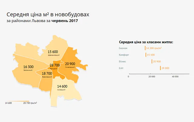 У Львові, як і раніше, найбільшою популярністю користується житло в Галицькому районі. Середня вартість нових квартир тут складає близько 29 тис. грн за м2. Друге місце розділили між собою Личаківський та Франківський райони, в яких квадратний метр житлової площі коштує 21 тис. грн. Найменша ціна, 16 тис. грн за м2, виставляється за житлову нерухомість, що знаходяться в Сихівському районі.