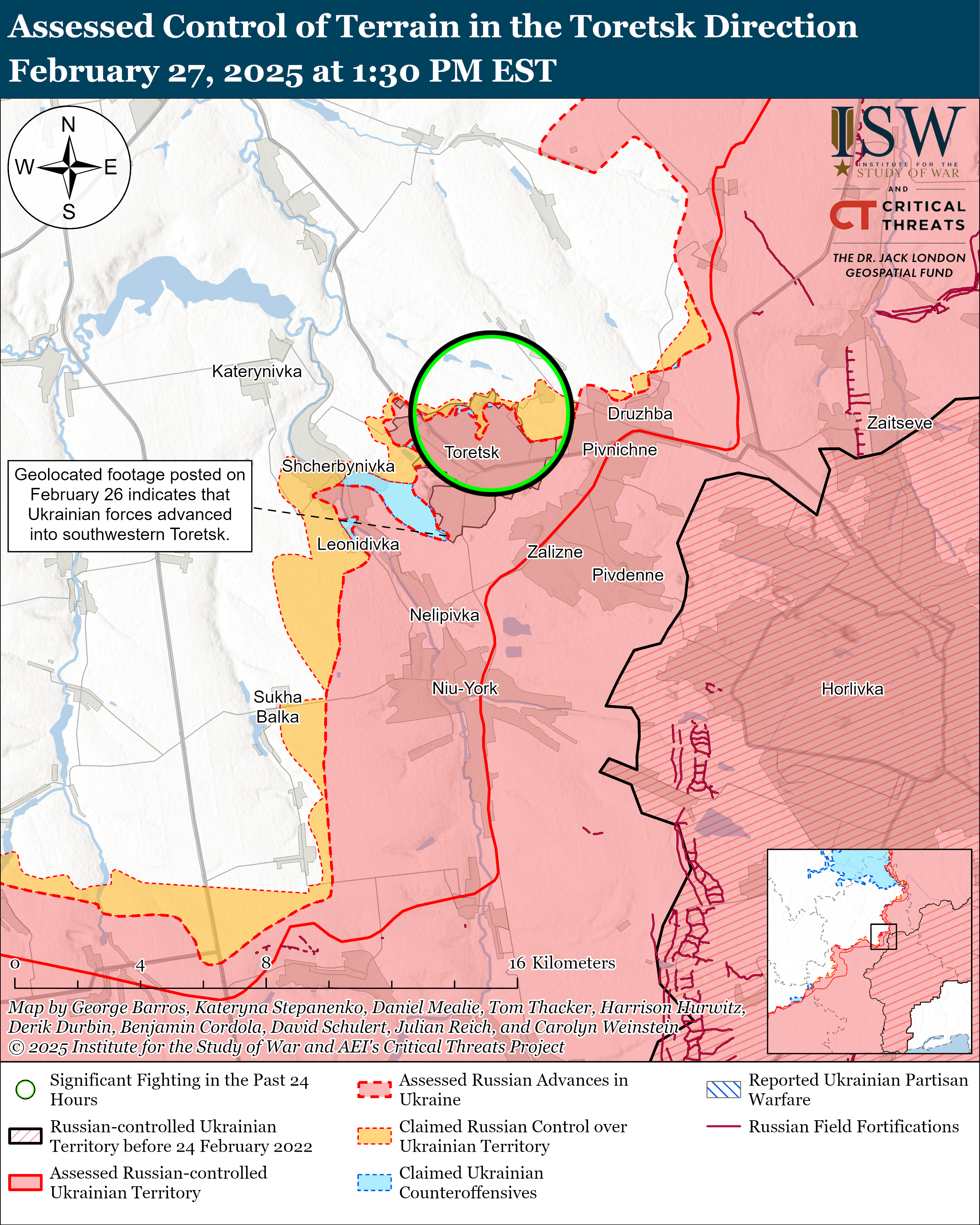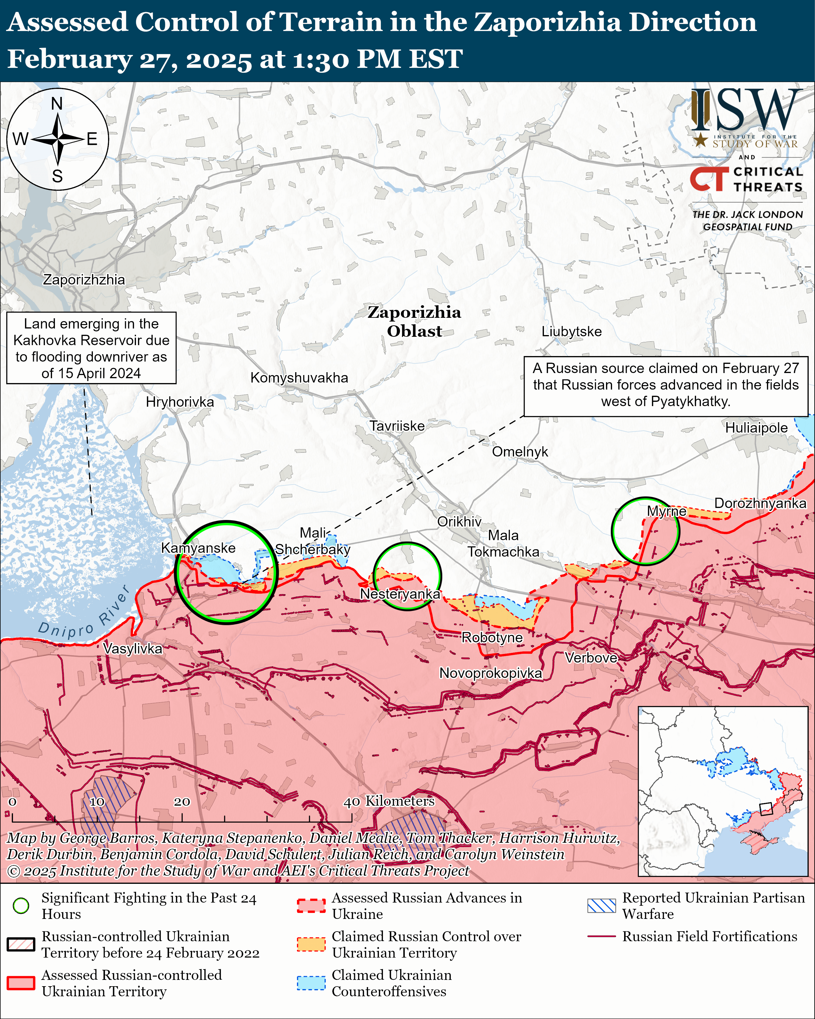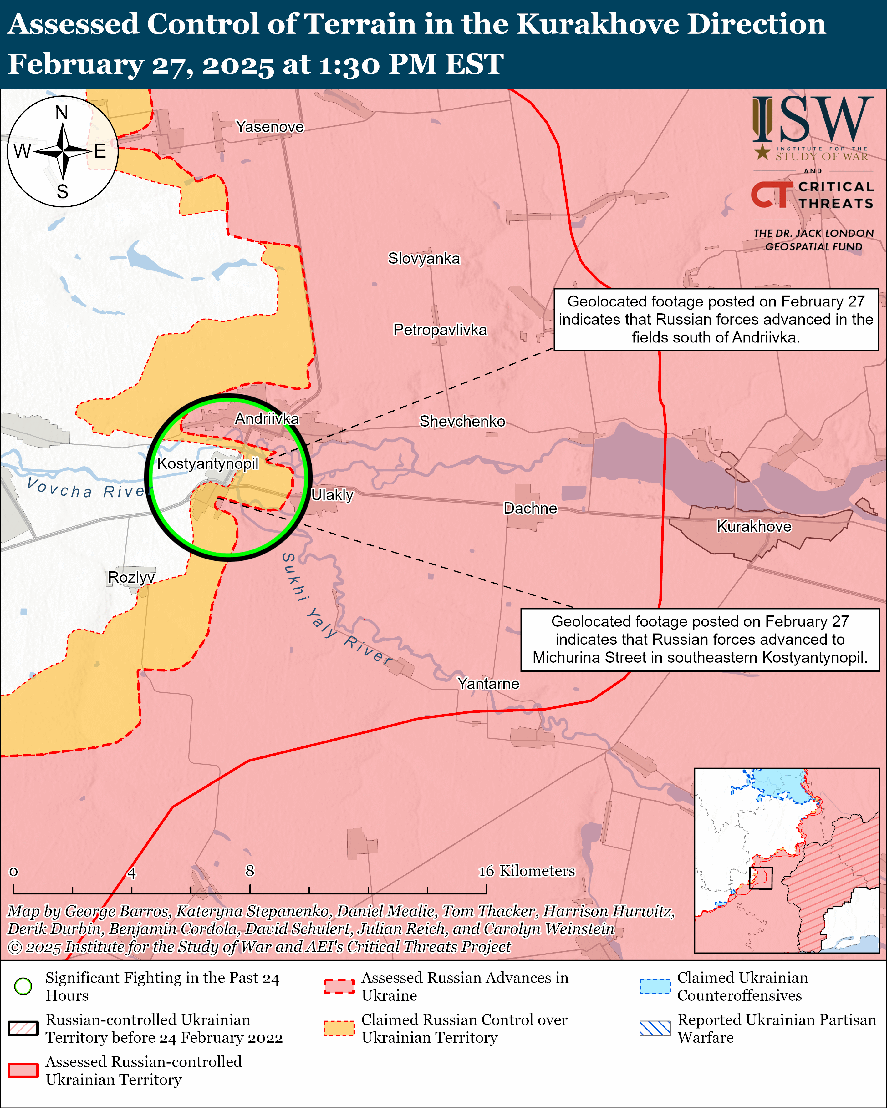 - Російські війська продовжували наступати в Курській області 27 лютого, але не досягли жодних успіхів. Бої тривали біля Старої Сорочини та біля Малої Локні.