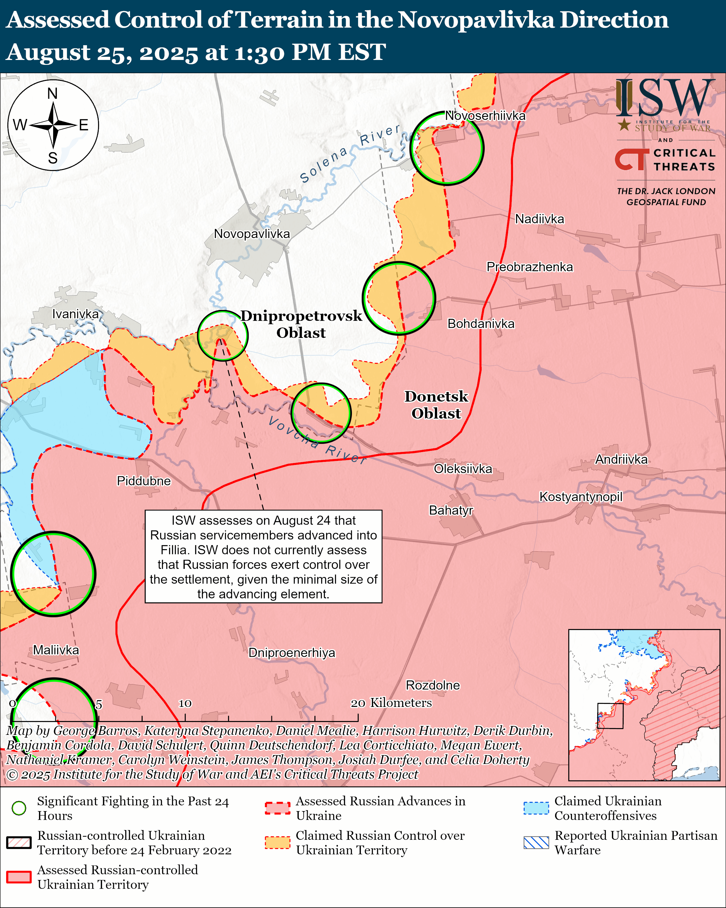 Окупанти нещодавно просунулися на Новопавлівському напрямку. Геолоковані кадри, опубліковані 24 серпня, вказують на те, росіяни могли захопити Ялту та просунулися до центральної Філії (обидва на південь від Новопавлівки).