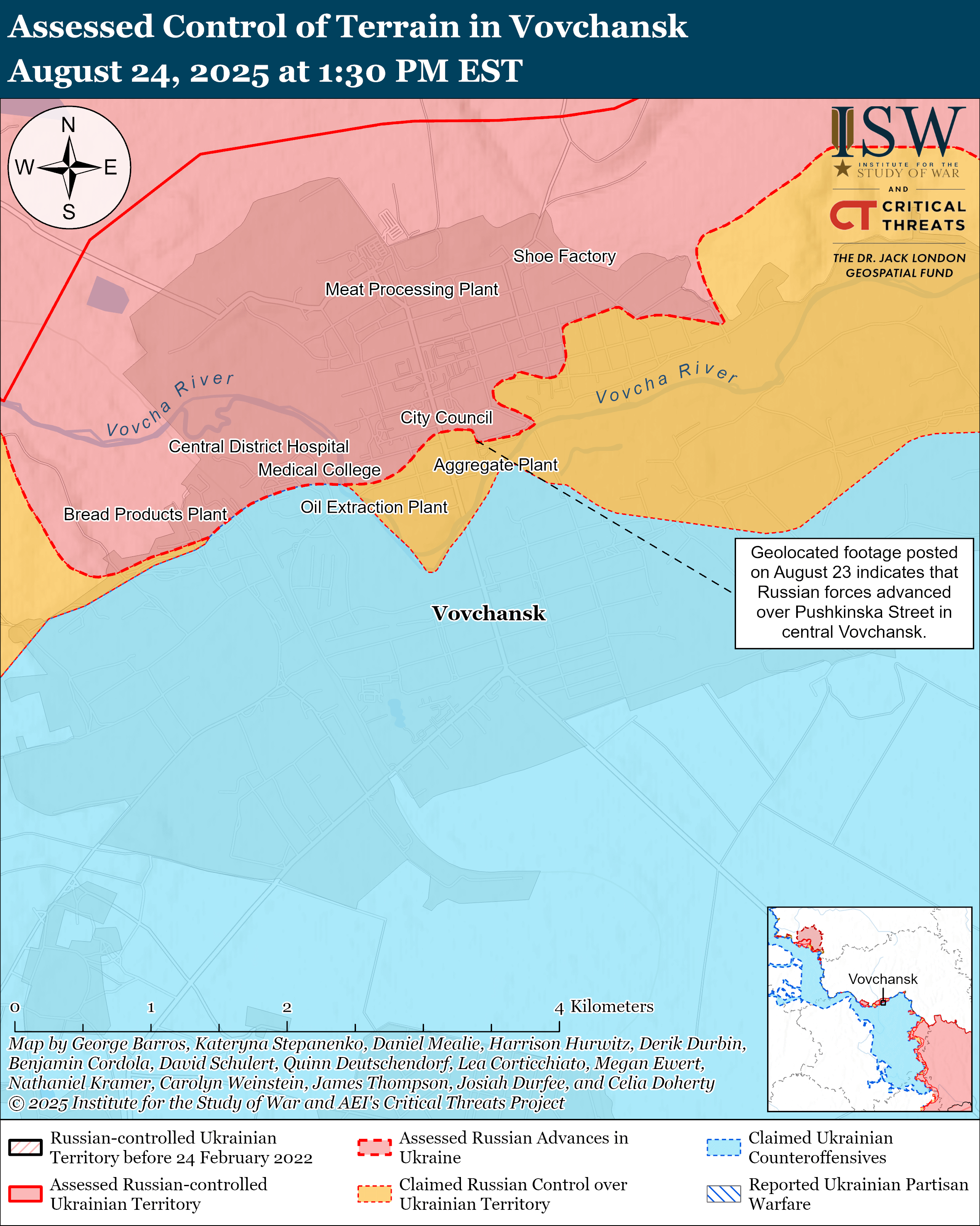 - За даними ISW, нещодавно російські війська просунулися на півночі Харківської області. Геолокаційні відеозаписи, опубліковані 23 серпня, свідчать про те, що окупанти просунулися в межах центрального Вовчанська (на північний схід від Харкова).