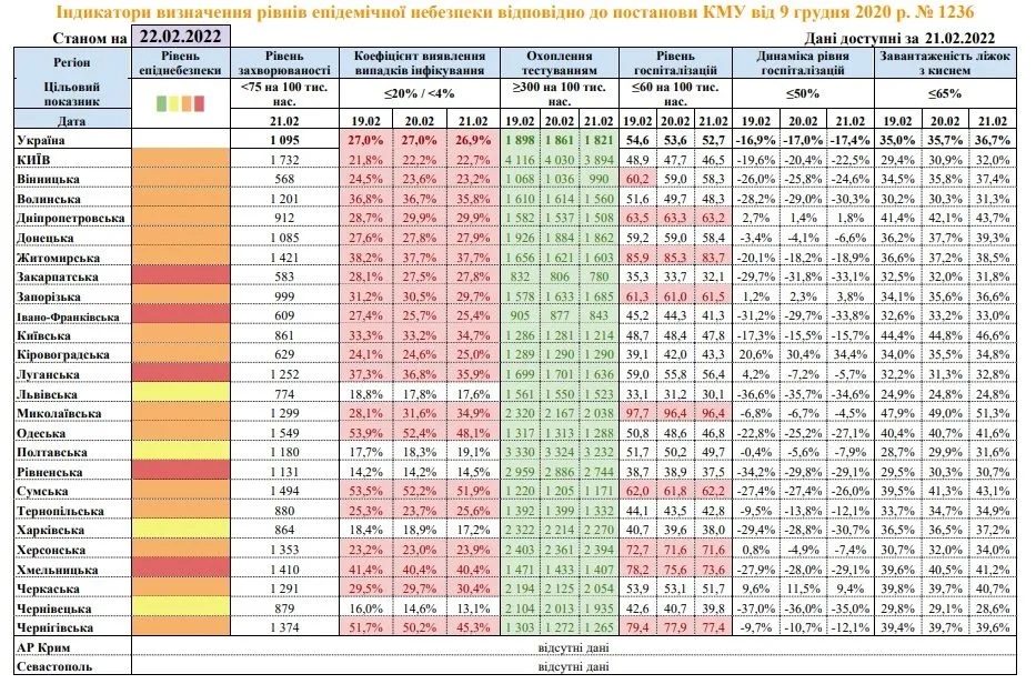 Станом на 22 лютого рівень захворюваності по країні становить 1 095 на 100 тисяч населення при визначеному індикаторі 75 на 100 тисяч людей. У Києві цей показник складає 1 732 на 100 тисяч людей.