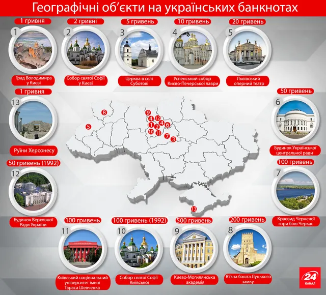 За цей час на реверсі (зворотньому боці банкноти) встигли побувати 13 визначних місць України. Сайт "24" підготував для вас "гривневу карту" України.