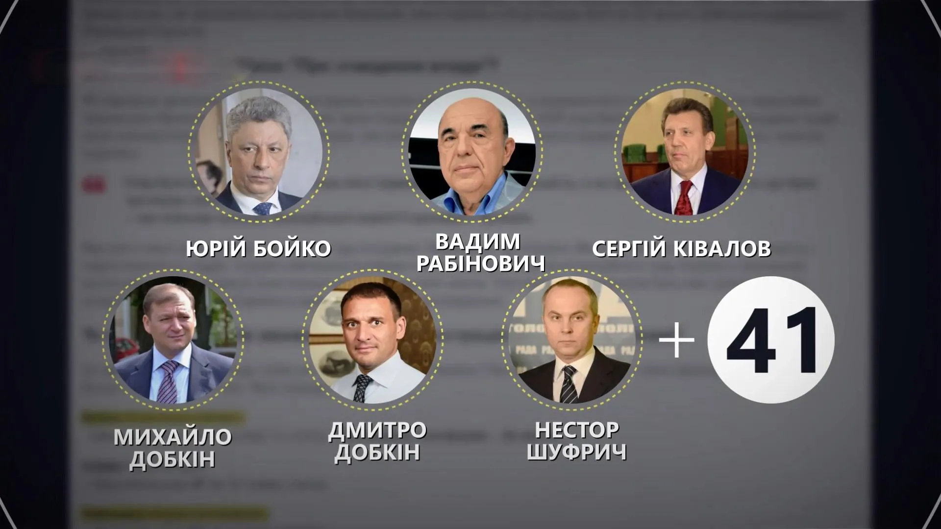 У списку тих, кому припікає "очищення влади": Бойко, Рабінович, Ківалов, два Добкіни, Шуфрич і ще 41 депутат. Вони вважають, що закон про люстрацію, нібито суперечить правам людини.