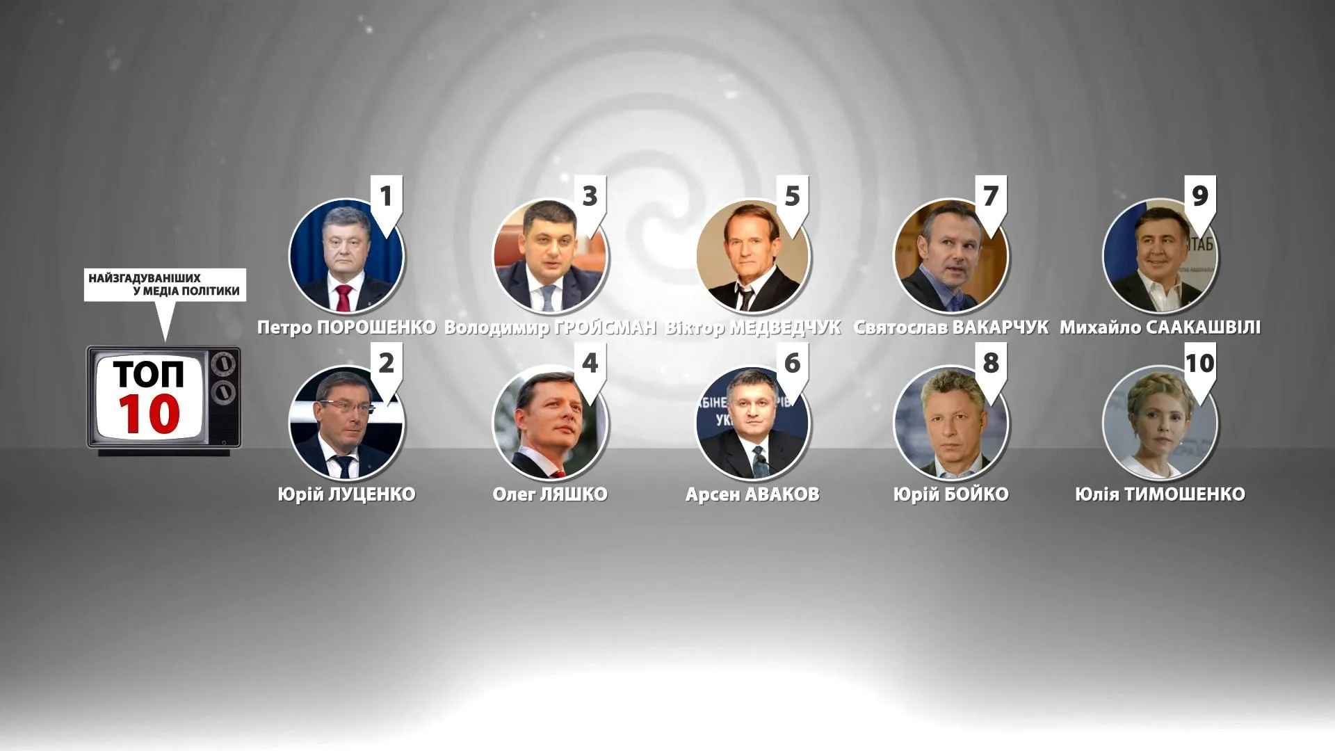 У десятці найбільш згадуваних – президент, генпрокурор, прем'єр, Ляшко, Медведчук, Аваков, Вакарчук, Бойко, Саакашвілі і єдина жінка – Тимошенко.