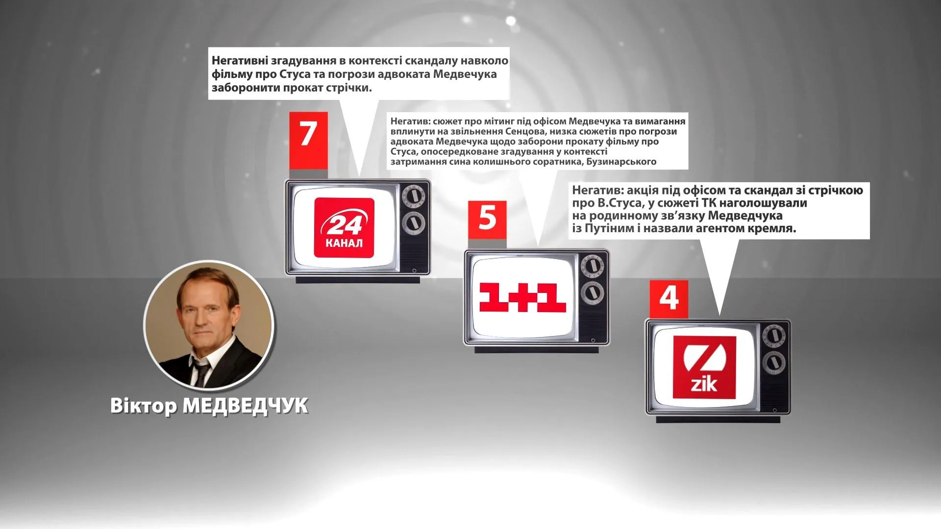 Найбільше негативу дісталось куму Путіна Віктору Медведчуку. Критичними до нього були 24 канал, "1+1" та Zik. Медведчук з'являвся на екранах через скандал зі стрічкою про Стуса – погрожував її заборонити та через акцію протесту під його офісом. Нейтрально висвітлював Медведчука тільки NewsOne.