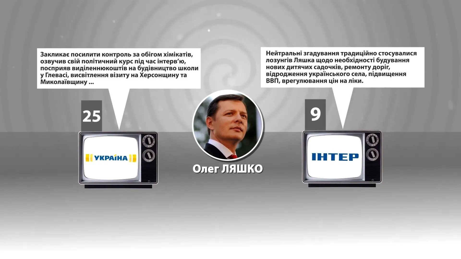 А ось найбільше позитиву з телевізорів вилилось на радикала Ляшка. Особливо ним захоплюються "Україна" та "Інтер", які належать олігархам Ахметову і Фірташу. Обоє в минулому підтримували "Партію регіонів". Однак президентом Ляшка українці не бачать.