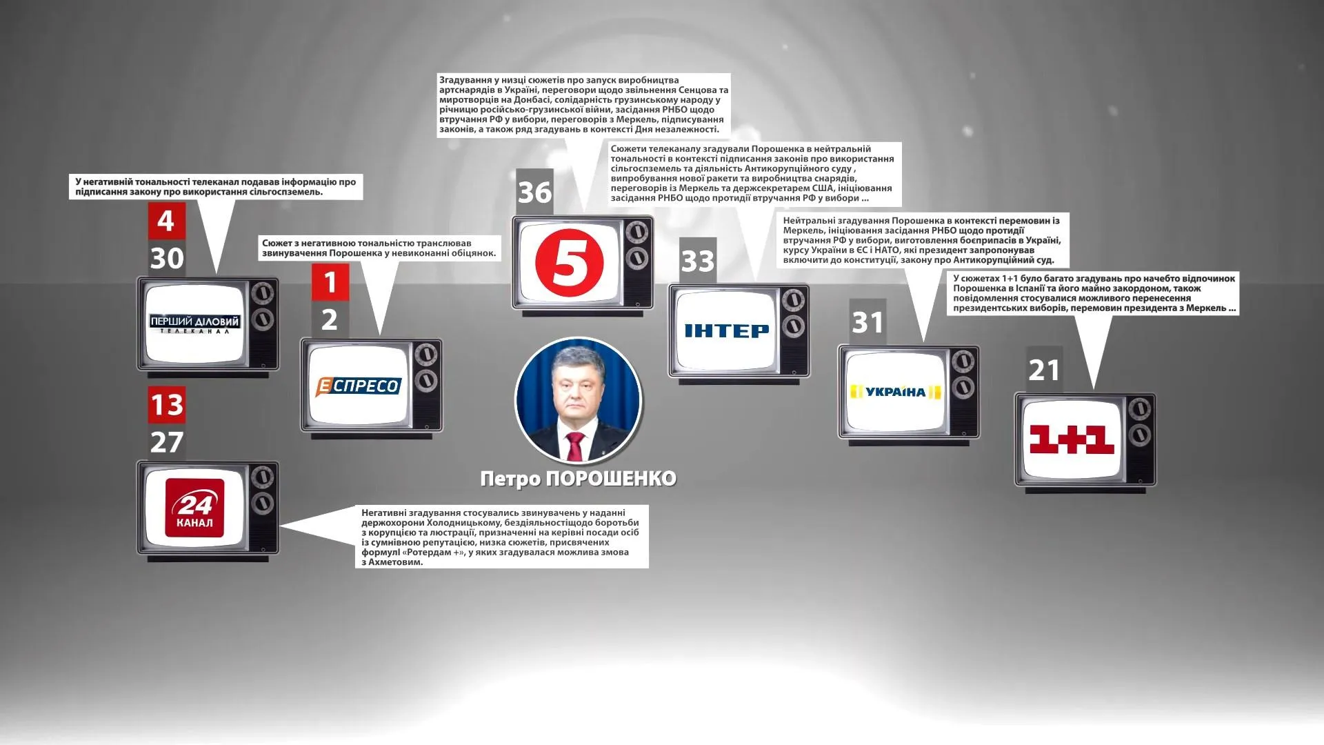 Чинного президента в силу посади показують всі. Переважна більшість каналів були нейтральними або хвалили президента, найчастіше – в новинах "5 каналу" (який йому належить), "Інтера", "України" і "1+1". Лиш деякі критикували, а найбільше це за відсутність боротьби з корупцією, скандальну схему "Роттердам+", сумнівні призначення та невиконані обіцянки.