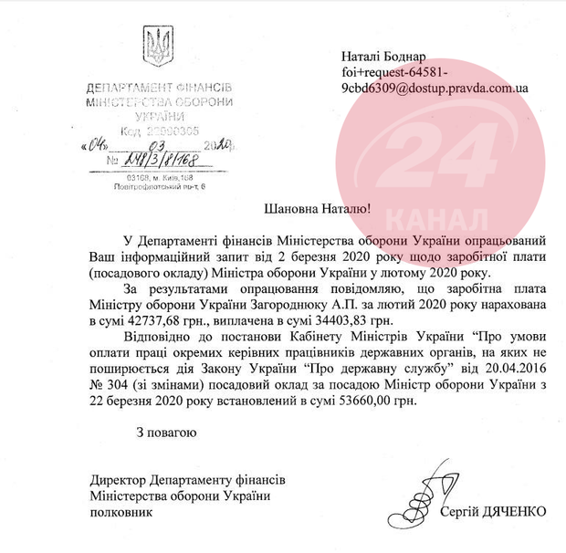 Відповідь Міноборони 24 каналу про зарплату Андрія Загороднюка