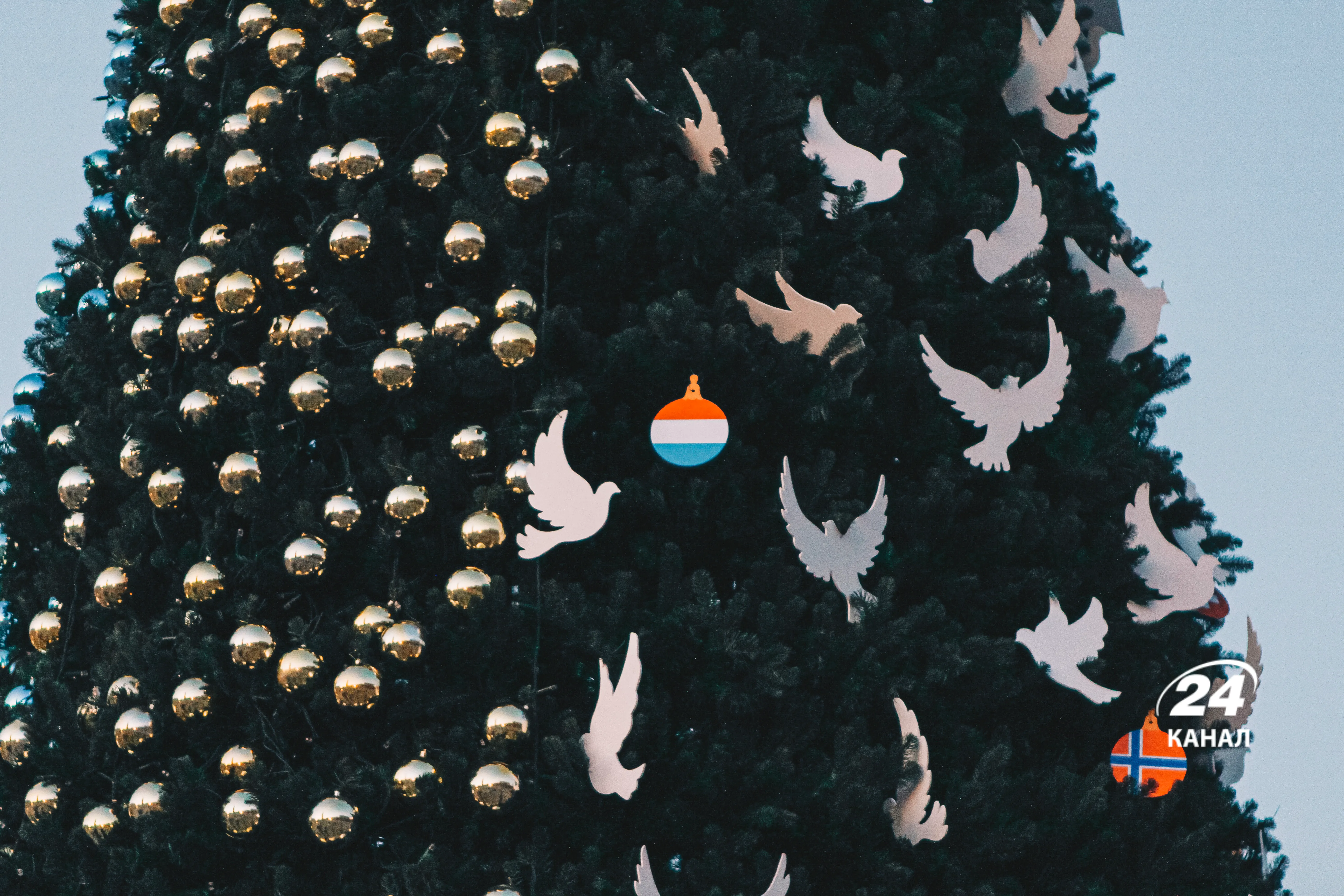 Ялинку оздобили прикрасами, які використовували у минулі роки – це близько 1000 іграшок, зокрема, кульки синього та жовтого кольорів, а також 500 білих голубів.
