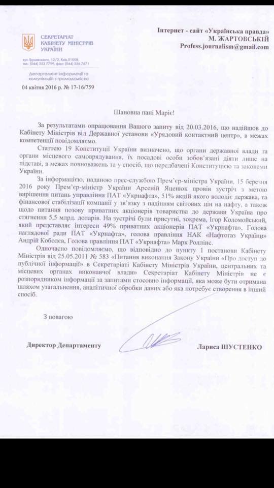 Про це йдеться у відповіді Секретаріату Кабінету міністрів на запит "Української правди".