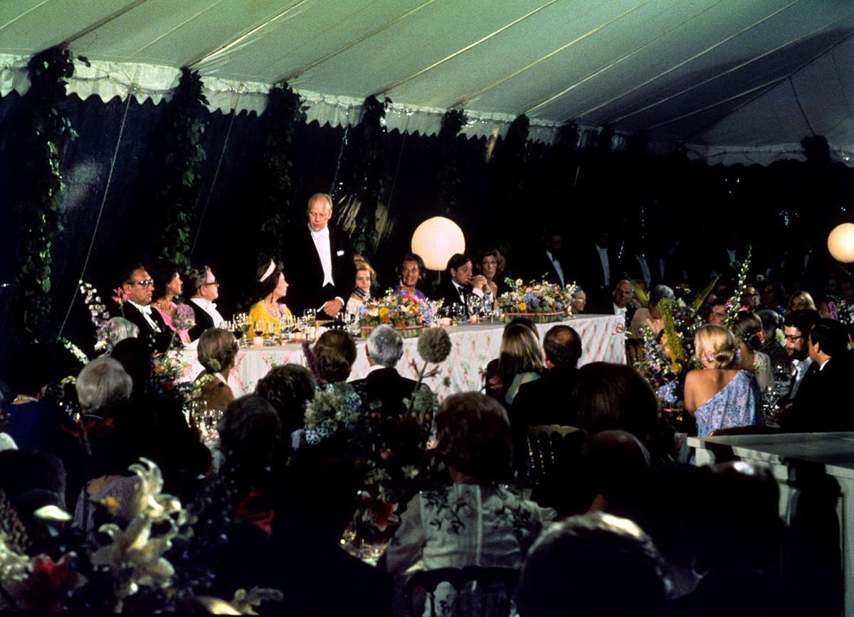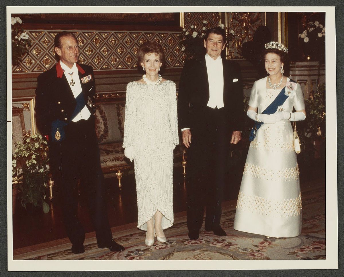 На банкеті в Букінгемському палаці, влаштованому на честь приїзду президента Джона Кеннеді (праворуч) та його дружини Жаклін Кеннеді (друга ліворуч). Ліворуч – чоловік Єлизавети II принц Філіп.