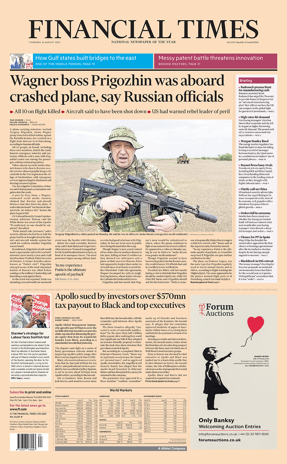 Водночас британське видання Financial Times, з посиланням на американського чиновника, вважає, що однією з версій є те, що літак Пригожина цілком могла вразити російська ППО.