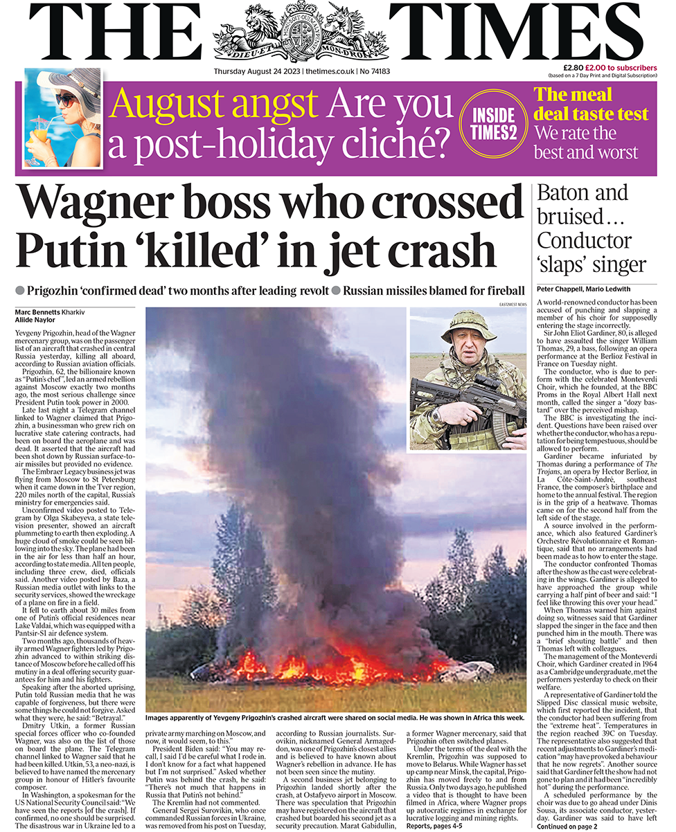 Думку колишніх колег поділяє й екскерівник МІ-6 сер Джон Соуерс, який вважає, що за смертю Пригожина стоїть особисто Путін.