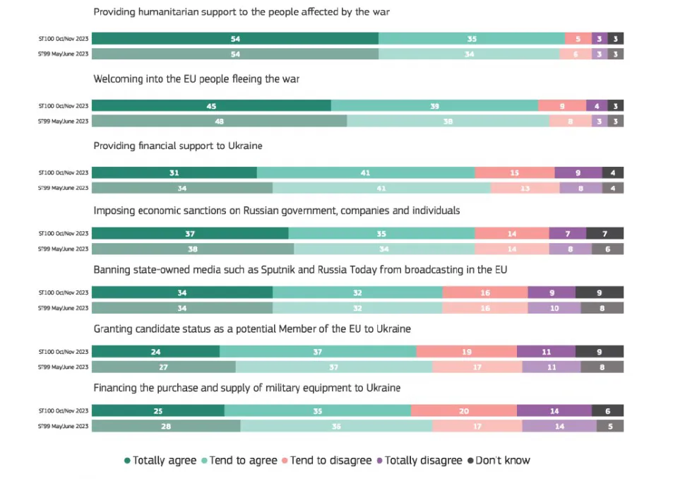 Про це свідчать підсумки опитування Євробарометра, результати якого опублікували на сайті Європейського Союзу. Опитування проводили з 23 жовтня до 15 листопада 2023 року у 27 країнах-членах ЄС й у ньому взяло участь 26 471 громадянин. Крім того, отримані результати також порівняли з опитуванням, яке проводили у травні – червні 2023 року, передає 24 Канал.