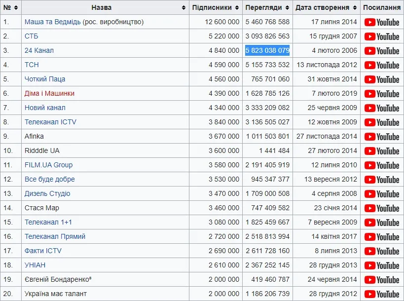 Ютуб-канал 24 Каналу має найбільшу кількість переглядів / Дані з Вікіпедії