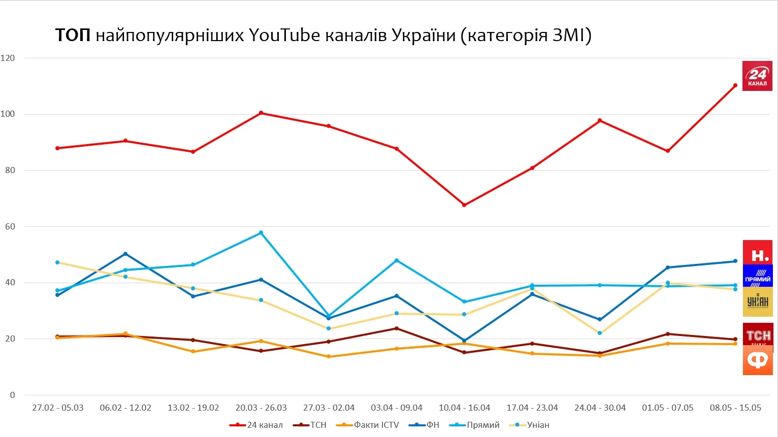 У категорії ЗМІ YouTube 24 Каналу сильно випереджає своїх конкурентів з інших ЗМІ. Зокрема, в період з 8 до 15 травня 2023 року наш канал має майже 120 мільйонів переглядів. Це удвічі більше, аніж найближчі конкуренти з "Фабрики Новин".