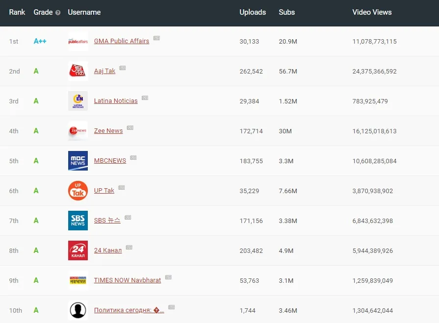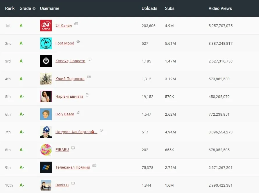 YouTube 24 Каналу у топ-10 рейтингу Social Blade на світовому ринку / Фото із сайту Social Blade