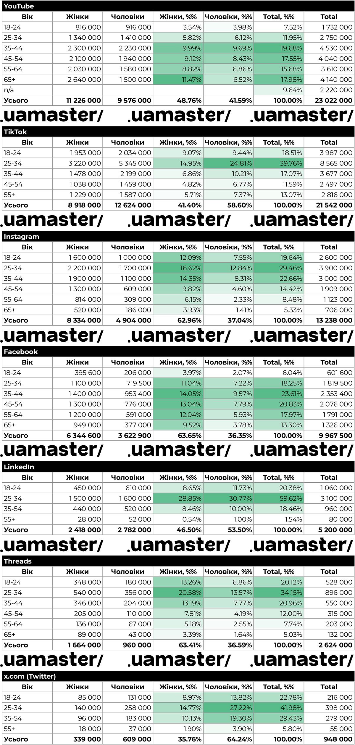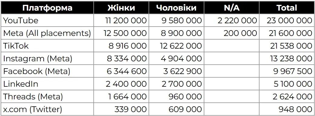 Зверніть увагу! В UAMASTER Digital Agency наголосили, що інформація у цій та наступних таблицях ґрунтується на даних рекламних кабінетів відповідних рекламних платформ. Наразі немає зовнішніх незалежних досліджень, які могли б підтвердити чи спростувати ці дані.