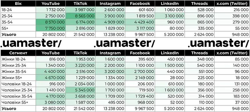 В UAMASTER Digital Agency підкреслили, що для аудиторії віком 18 – 34 ставку потрібно робити насамперед на TikTok та Instagram. А для користувачів від 35 років і старше – обов'язково має бути YouTube.